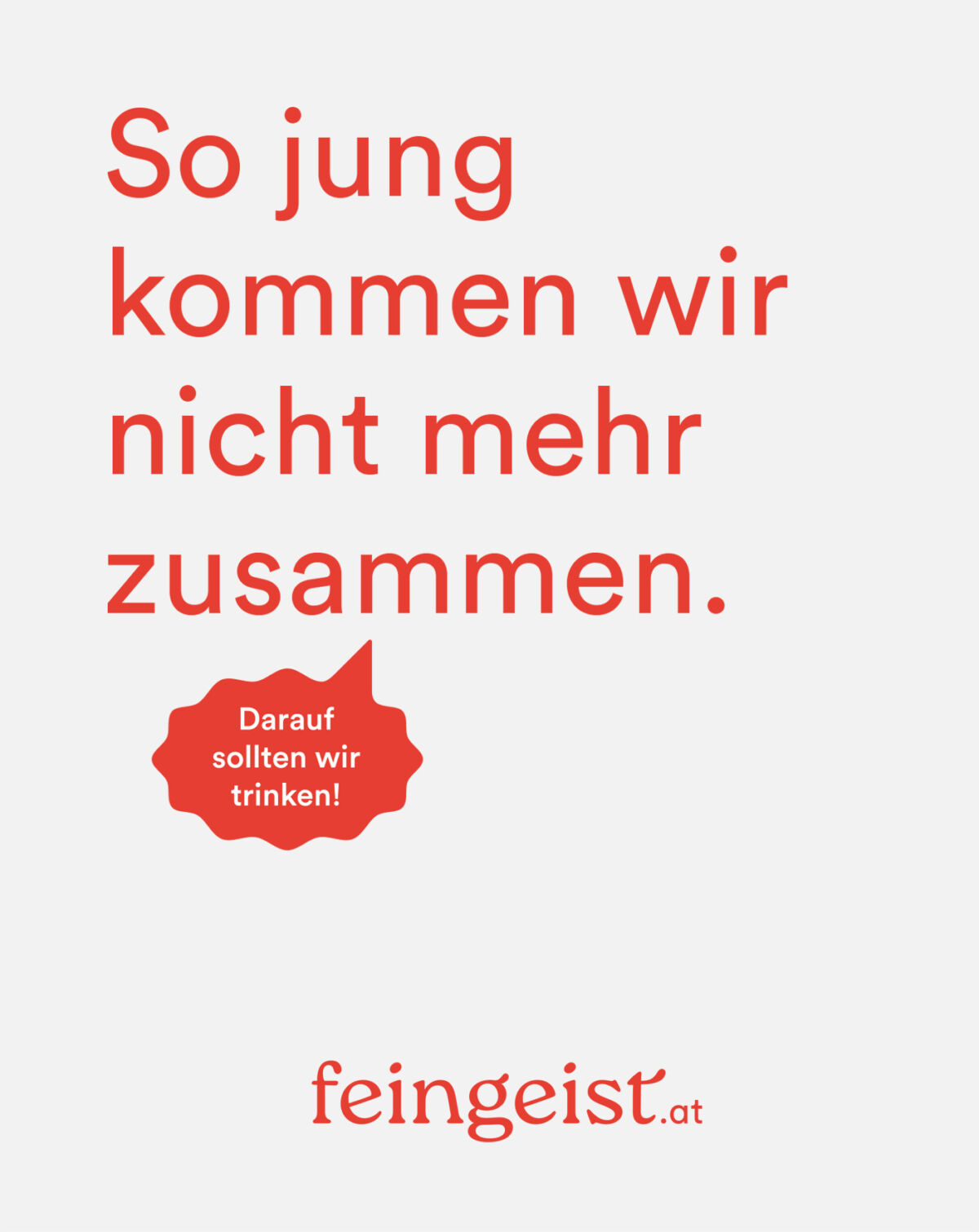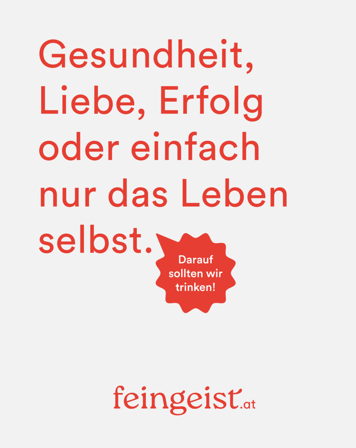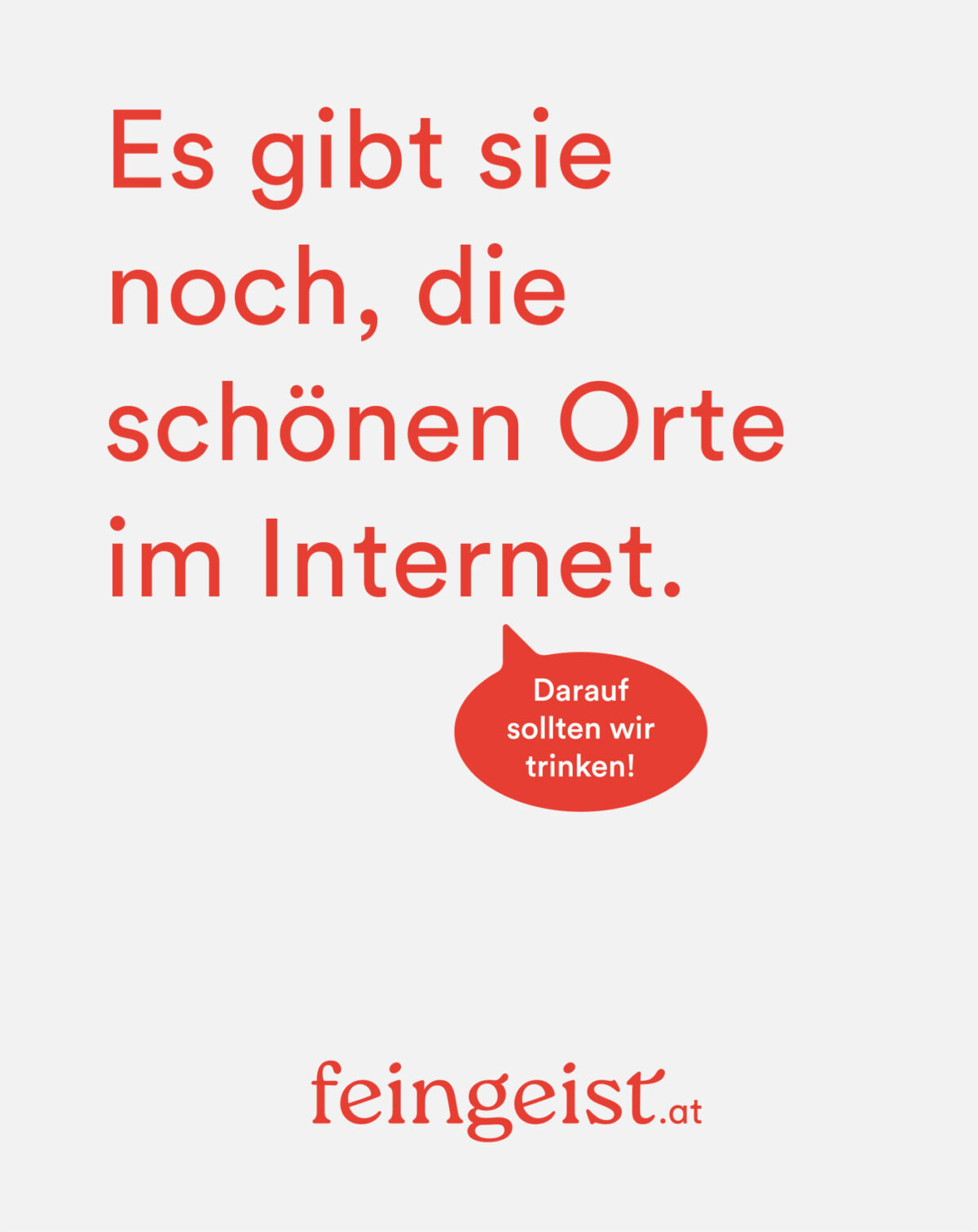 Mit „Darauf sollten wir trinken!” haben wir einen Claim entwickelt, der motiviert und zum Mittrinken und Anstoßen einlädt. Um gemeinsam das Glas zu erheben, gibt es unzählige Gründe. Kleine, große, lustige, traurige und manchmal auch ganz marginale. feingeist ist für alle da. Die Marke wird durch den sympathischen Satz sofort mit positiver Energie aufgeladen.
