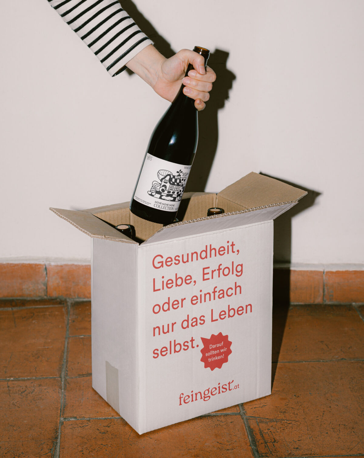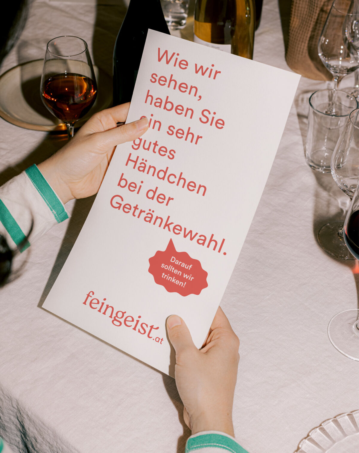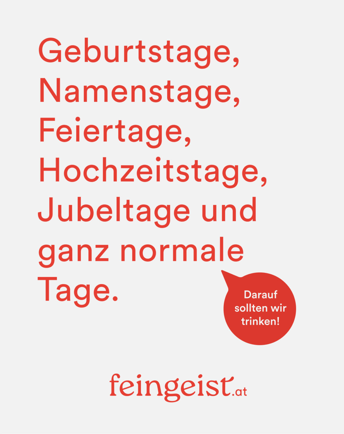 Mit „Darauf sollten wir trinken!” haben wir einen Claim entwickelt, der motiviert und zum Mittrinken und Anstoßen einlädt. Um gemeinsam das Glas zu erheben, gibt es unzählige Gründe. Kleine, große, lustige, traurige und manchmal auch ganz marginale. feingeist ist für alle da. Die Marke wird durch den sympathischen Satz sofort mit positiver Energie aufgeladen.