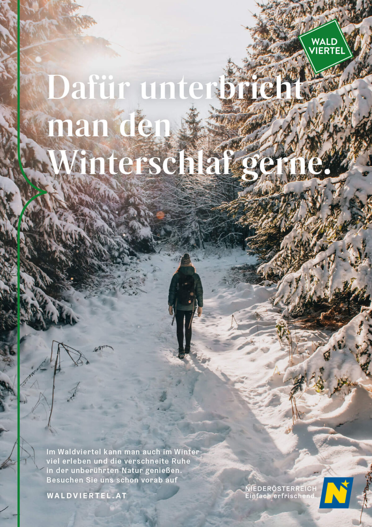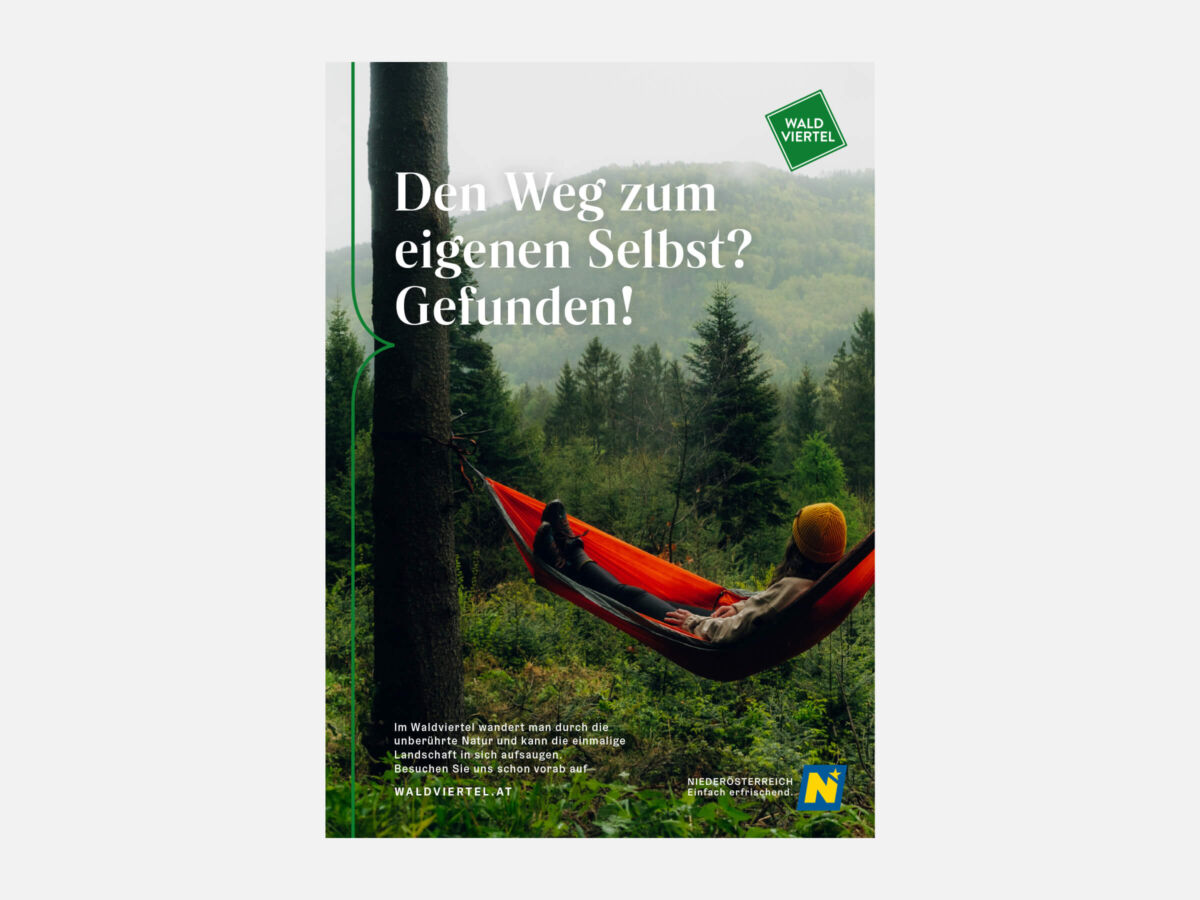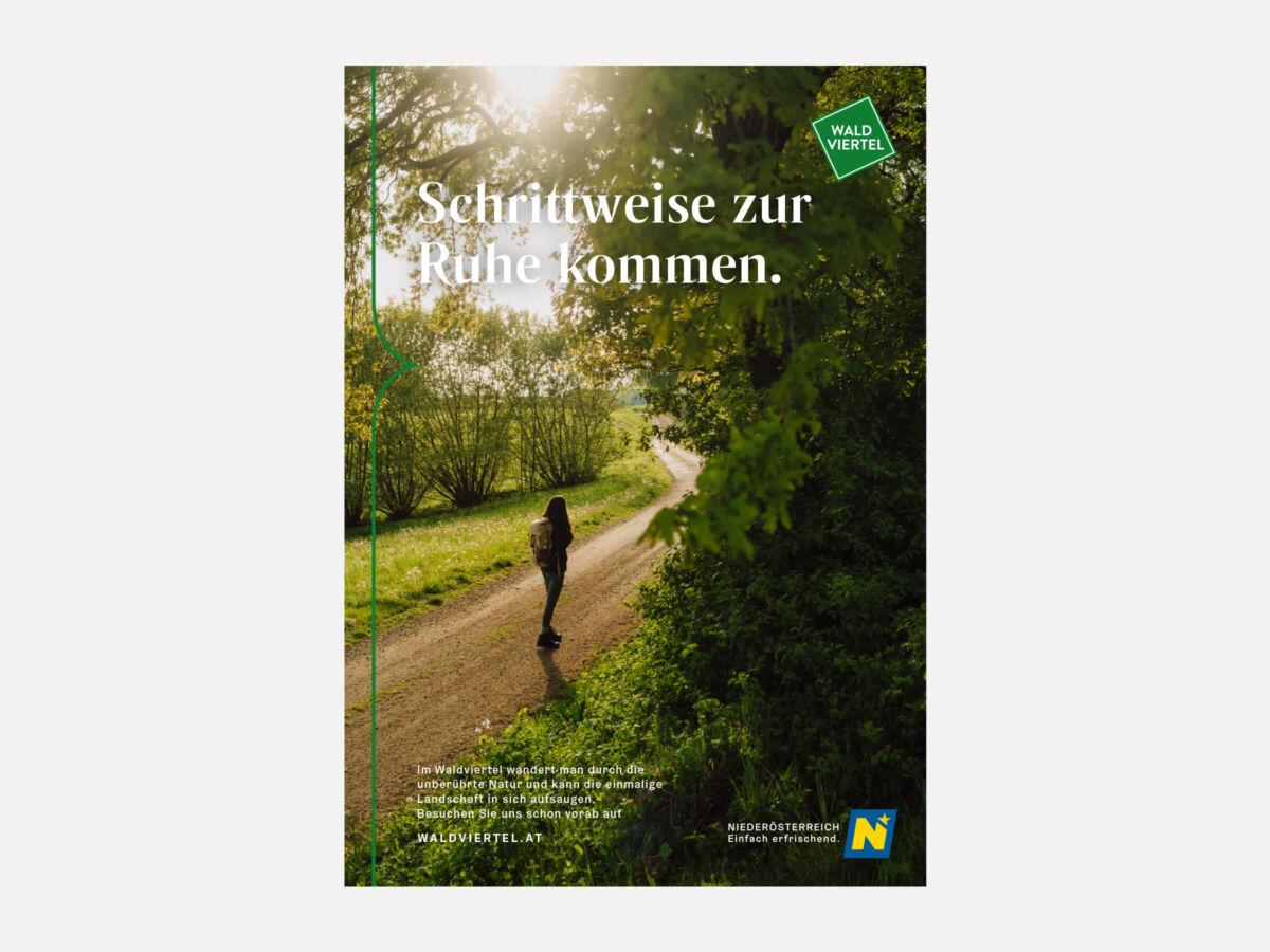 Besonders schön sieht man bei den Sujets auch das neue Corporate Design, das wir für die Niederösterreich Werbung entwickelt haben. Das Designelement der geschwungenen Klammer bzw. der stilisierten Sprechblase – im Fall vom Waldviertel in Grün gehalten – dient als Unterscheidungsmerkmal zwischen Hauptkampagne und regionaler Kommunikation und ist die zeitgemäße Weiterentwicklung der schon bekannten Designsprache der letzten Jahre.