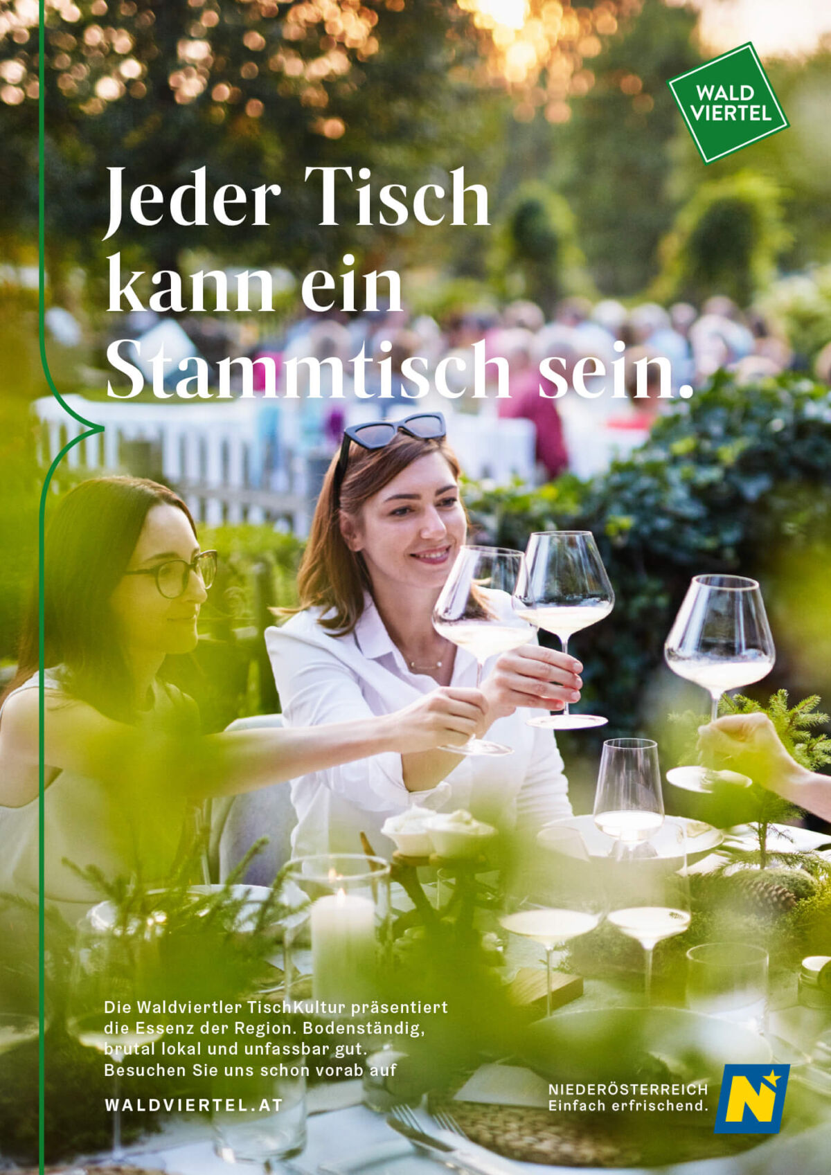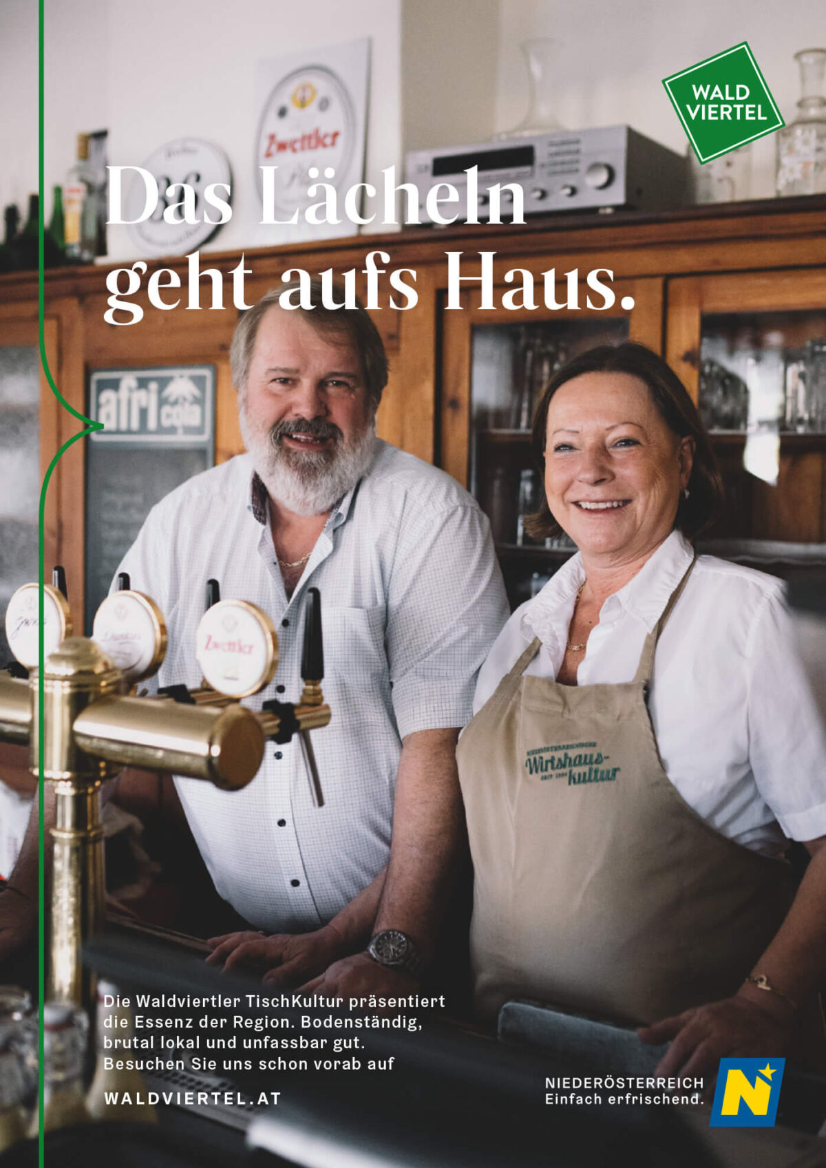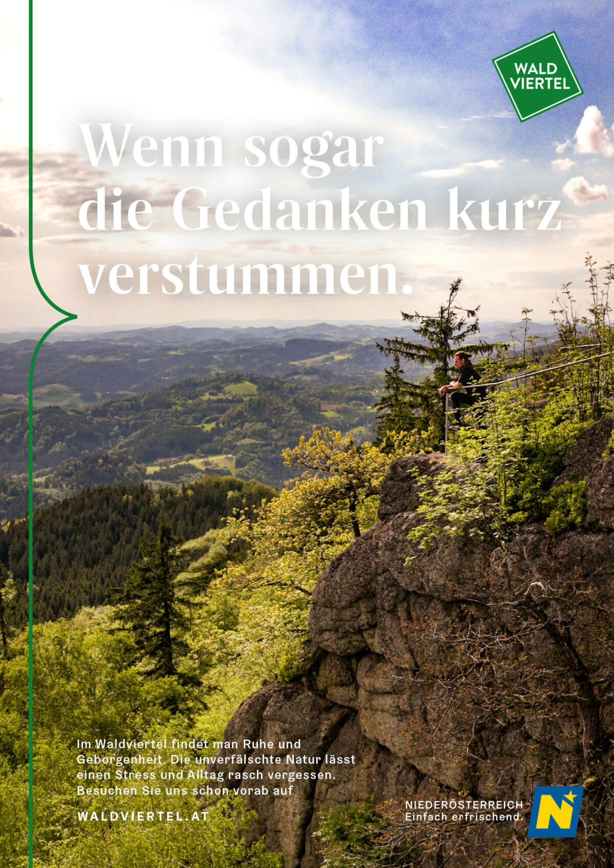 Besonders schön sieht man bei den Sujets auch das neue Corporate Design, das wir für die Niederösterreich Werbung entwickelt haben. Das Designelement der geschwungenen Klammer bzw. der stilisierten Sprechblase – im Fall vom Waldviertel in Grün gehalten – dient als Unterscheidungsmerkmal zwischen Hauptkampagne und regionaler Kommunikation und ist die zeitgemäße Weiterentwicklung der schon bekannten Designsprache der letzten Jahre.